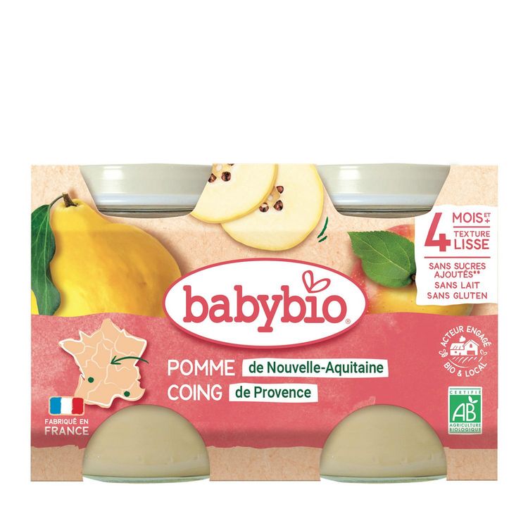 Pommes de Nouvelle-Aquitaine* 73%, purée de coings de Provence* 27% (coings*, eau). *Ingrédients issus de l'agriculture biologique