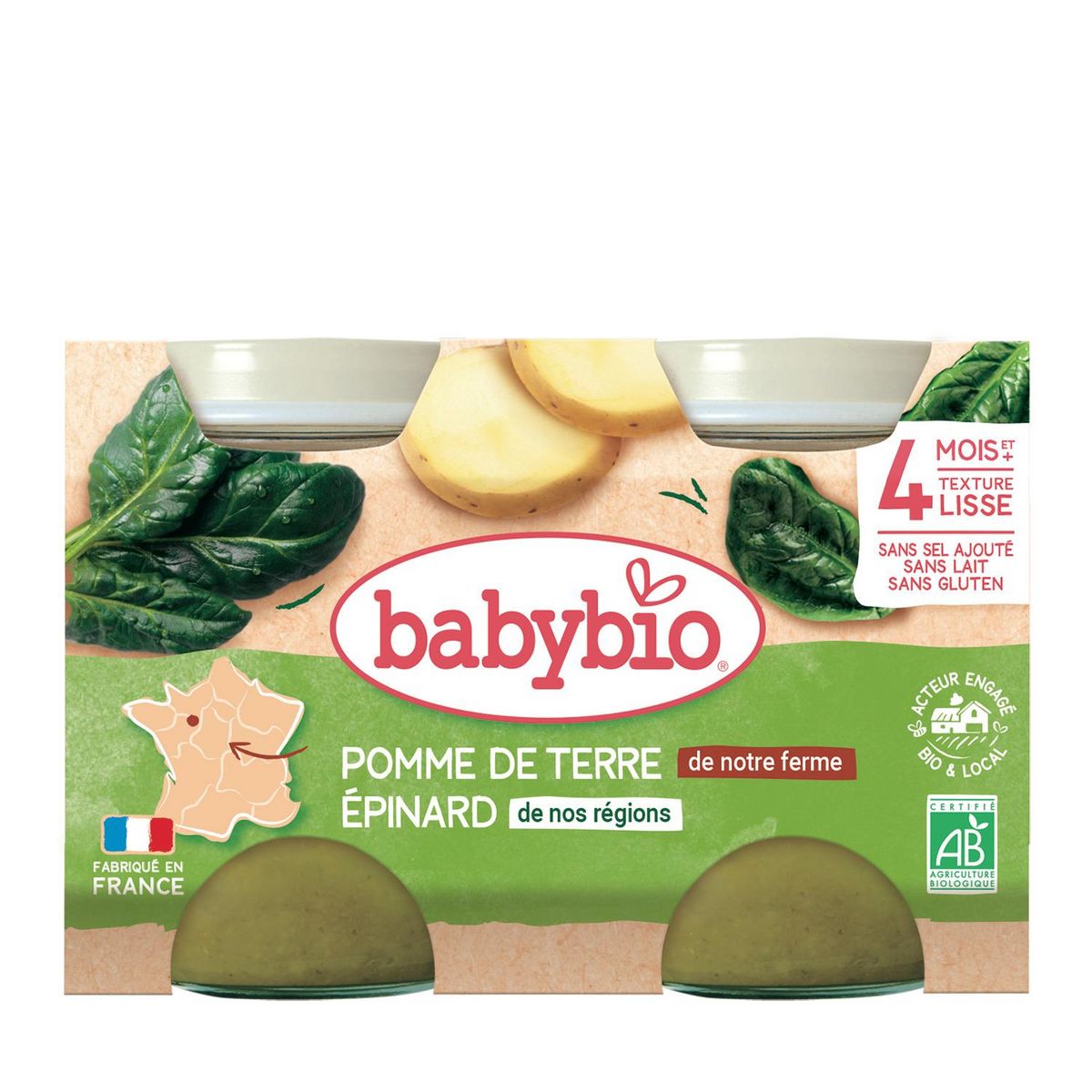 Pommes de terre de notre Ferme en Pays de la Loire* 38%, eau de cuisson, épinards de France* 23%, jus de citron de Sicile*. *Ingrédients issus de l'agriculture biologique