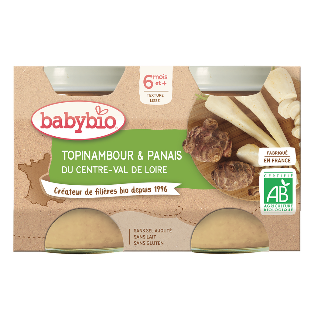 Topinambours du Centre-Val de Loire* 26%, panais du Centre-Val de Loire* 25%, eau de cuisson, pommes de terre du Centre-Val de Loire* 24%, jus de citron de Sicile*. *Ingrédients issus de l'agriculture biologique