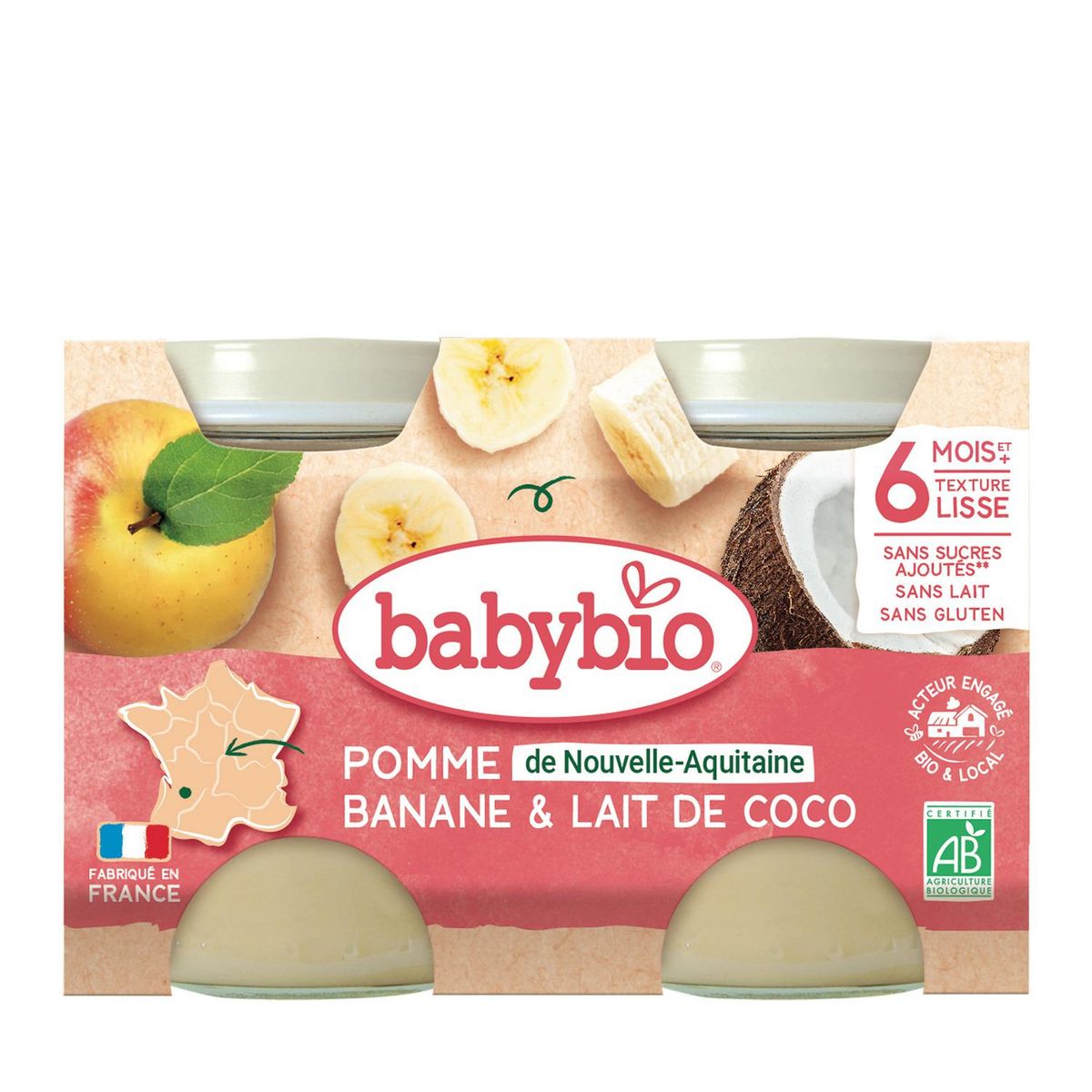 Pommes de Nouvelle-Aquitaine* 69,5%, bananes d'Equateur* 20%, lait de coco du Sri Lanka* 10% (noix de coco*, eau), jus concentré de citron d'Espagne*. *Ingrédients issus de l'agriculture biologique