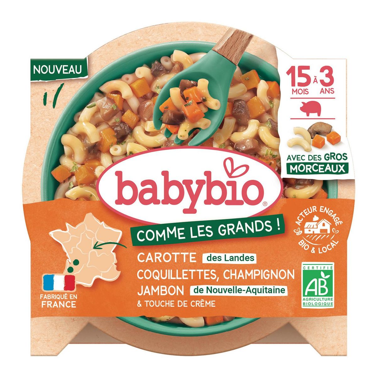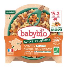 Carottes des Landes* 35%, PÂTES coquillettes cuites* 30% (eau, semoule de BLÉ dur*, blanc d' ŒUF*), champignons* 14%, jambon de Nouvelle-Aquitaine* 9%, eau de cuisson, CRÈME FRAÎCHE de France* 3.5%, amidon de maïs*, persil de France*, ail d'Espagne*. *Ingrédients issus de l'agriculture biologique
