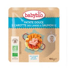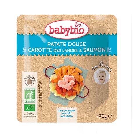 purée de légumes et saumon bio; Aliment pour bébés Un saumon qui a la patate Patates douces, carottes des Landes et saumon : des ingrédients sélectionnés avec soin pour une harmonie de saveurs. Avec cette recette, bébé va voir la vie en orange !
