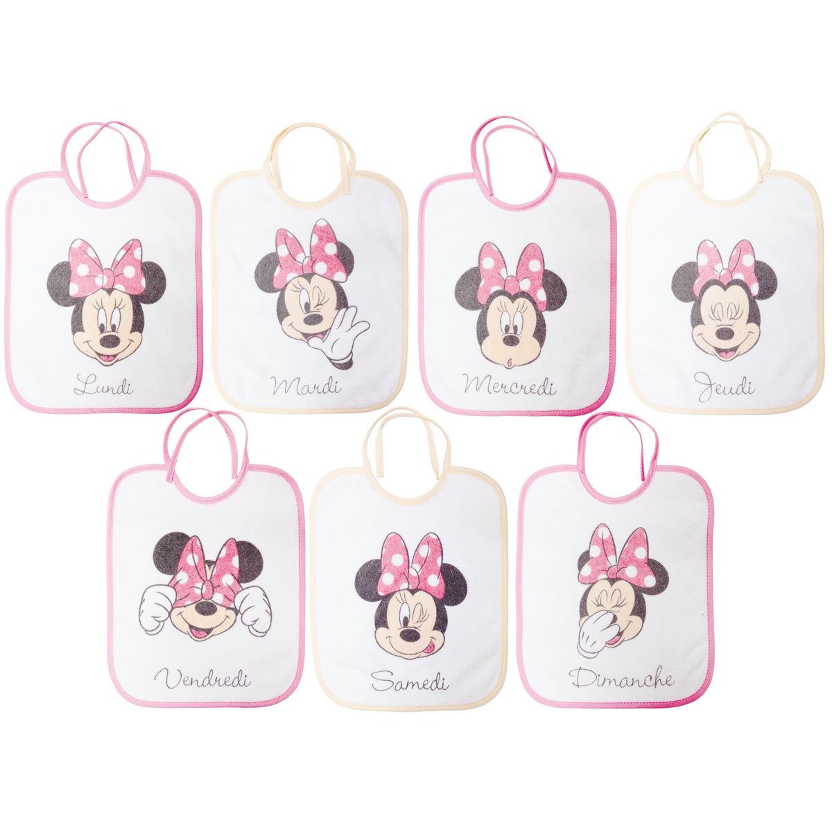 Ce lot de 7 bavoirs pour la semaine Minnie est idéal pour les premiers repas de Bébé. Il vous permet d'équiper Bébé pour toute une semaine avec Minnie. Composé en éponge à 76% de coton et à 24% de polyester, il absorbera parfaitement les bavures de bébé durant le repas tout en douceur. La fermeture à lien vous permettra de l'enfiler facilement. Pratique, il passe en machine jusque 40° pour être tout propre la semaine d'après ! C'est un cadeau naissance utile et mignon.