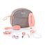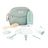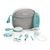 - 9 accessoires essentiels pour prendre soin de bébé : un thermomètre digital avec embout souple, un mouche bébé par aspiration buccale (avec réservoir anti-retour de sécrétions), une paire de ciseaux à bout arrondi, un coupe ongle, une lime à ongle, un thermomètre de bain, une brosse douce, un anneau de dentition réfrigérable et un masseur de gencives.