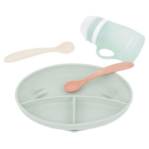 Complet, il est composé d'une gourde, de deux cuillères et d'une assiette, tous en silicone alimentaire.