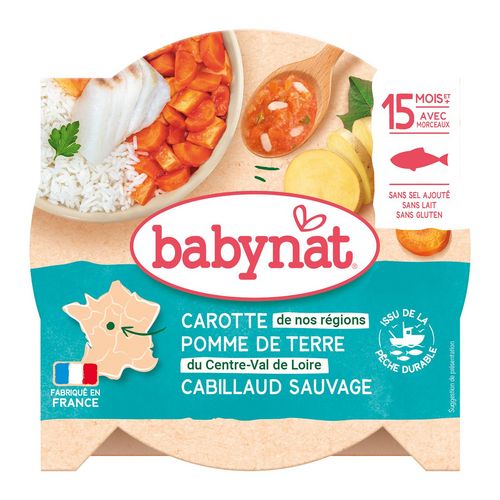 Ça frétille de bonheur, Le saviez-vous ? Babynat est une gamme, mettant à l’honneur des recettes exclusivement concoctées avec des poissons sauvages, issus de la pêche durable. Ces poissons, vivants à l’état sauvage, ne peuvent être certifiés selon le mode de production de l’agriculture biologique. purée de légumes cabillaud et riz avec morceaux. Aliment pour bébés
