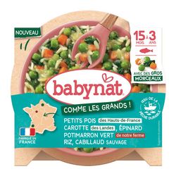 Petits pois des Hauts-de-France* 27%, carottes des Landes* 20%, riz cuit* 19% (eau, riz*), CABILLAUD sauvage d'Islande 10%, eau de cuisson, purée de potimarrons verts de notre Ferme en Pays de la Loire* 6%, épinards* 6%, amidon de maïs*, aneth de France*.