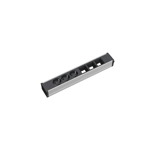 La multiprise de table Bachmann CONI est conçue pour les bureaux modernes, offrant 3 prises Schuko orientées à 35° pour un accès facilité à l'alimentation et aux médias. Son design épuré en aluminium anodisé assure durabilité et esthétique. Avec une largeur de 356 mm, elle se monte discrètement sur