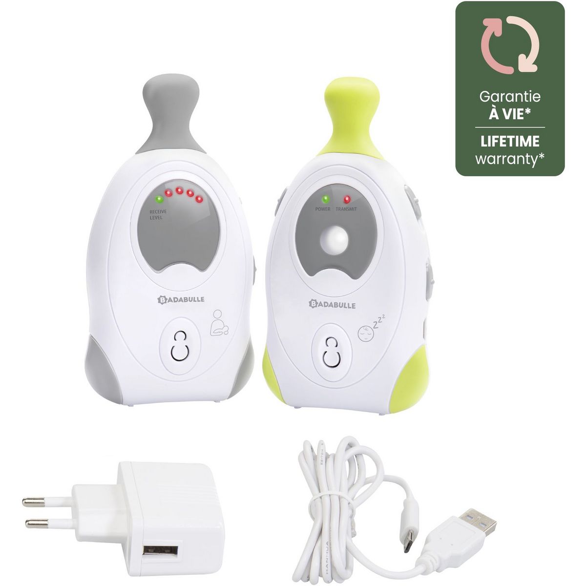 Cet écoute-bébé vous offre toutes les fonctions indispensables d'un babyphone audio, pour une utilisation simple et sûre : alarme visuelle, sonore et vibreur, mode continu ou mode VOX (activation à la voix pour économiser la batterie), alarme hors de portée lorsque l'unité parent est trop éloignée, indicateur de batterie faible et bien d'autres. Un écoute-bébé aux nombreuses fonctionalités pour surveiller votre bébé et le rassurer ! S'il n'aime pas dormir dans le noir, le babyphone dispose même d'une fonction veilleuse pour le rassurer ! En plus du son et de la lumière, le mode vibreur sur l'unité parent vous alerte si bébé se réveille. Sa portée de 300m en fait le babyphone idéal pour les appartements. Equipé d'une technologie analogique, proposant 2 canaux sélectionnables, le Baby Online 300m+ de Badabulle est ""basse puissance d'émission d'ondes"": de quoi surveiller bébé tout en préservant sa santé. Son petit plus : il est fourni avec un adaptateur secteur pour l'unité bébé. Un câble de rechargement micro-USB pour l'unité parent est également inclus, mais les deux unités fonctionnent également avec des piles AAA.