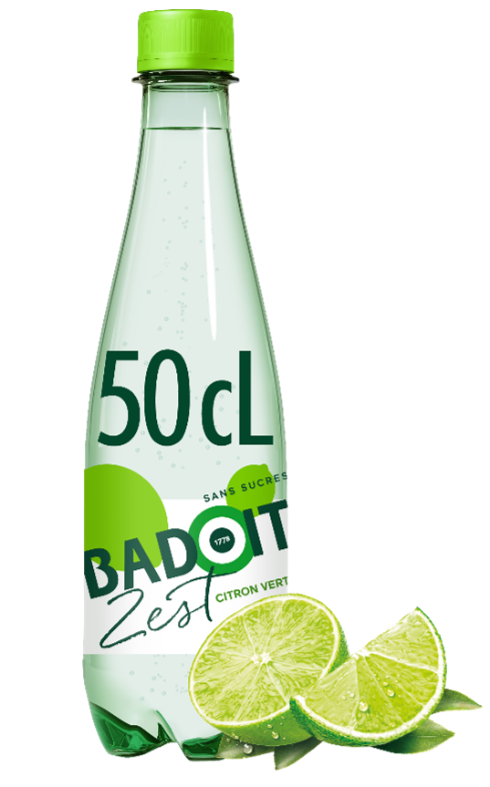 Eau minérale naturelle gazéifiée Badoit (99,9%), arôme naturel de citron-citron vert