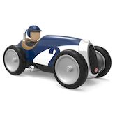 Voiture de course miniature bleue, en métal, dimensions 18x9x10 cm. Présentée en boîte cadeau (22x10,5x9,5 cm). Dès 1 an.