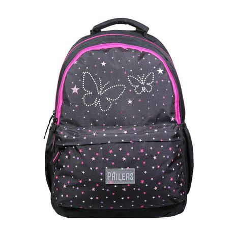Le sac à dos 2 compartiments Phileas est très innovant grâce à son système Smart Comfort qui le rend si unique. Son design ergonomique est inspiré des sacs de randonnée pour en faire le PLUS CONFORTABLE DES SACS A DOS ! Avec son design pétillant, ses étoiles et ses papillons, les amoureux des univers féériques seront comblés ! Ce grand sac avec ses 2 compartiments et sa poche avant permettra à votre enfant d'y ranger sans problème toutes ses fournitures scolaires. Il pourra glisser sa bouteille dans la poche côté qui est adaptée. Ses dimensions de 29,5cm de long, 19cm de large et 40cm de haut sont adaptées pour les altes de primaire et de collège. Coloris noir. 100% polyester. Le dos moulé en mousse EVA permet au sac d'épouser parfaitement le dos de l'enfant en allégeant la pression sur la colonne vertébrale. La mousse haute densité en demi-lune permet de protéger le bas du dos. Les bretelles ergonomiques enveloppent la partie avant des épaules avec une mousse ultra confort. Des sangles de rappel de charge permettent le réglage en hauteur, le tout pour une meilleure répartition du poids sur les épaules et un portage au plus près du dos garantissant une très bonne stabilité. Pour garantir la sécurité de votre enfant, ce sac à dos est équipé de bandes réfléchissantes. Soyez certain que ce modèle robuste garanti 10 mois ne vous décevra pas.