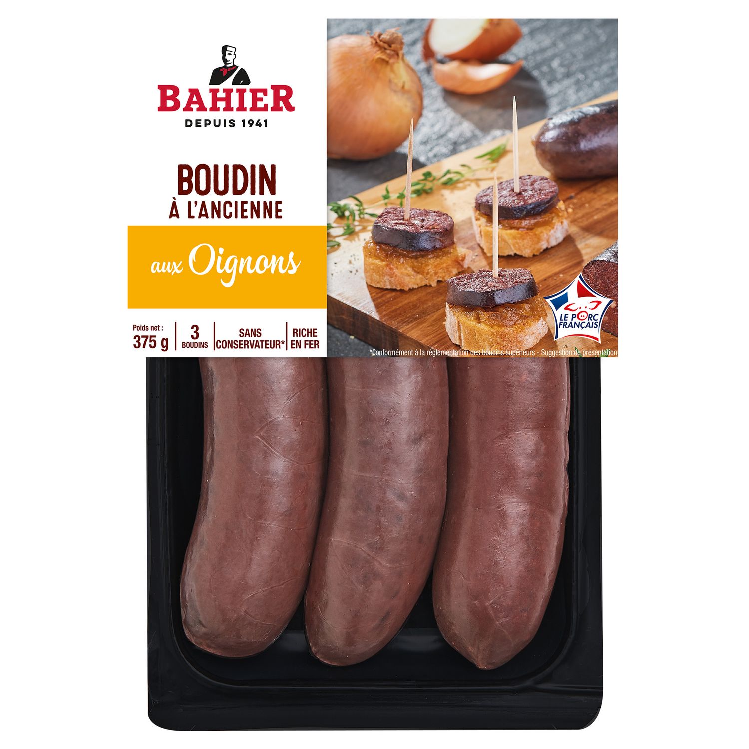 Ingrédients : Ingrédients : Sang de porc, oignons 34%, gras de porc, couenne, sel, sucre, épices, plantes aromatiques.Enveloppe : boyau naturel de porc.Traces éventuelles de gluten de blé, lait, oeufs, moutarde, fruits à coque, mollusques, sulfites.