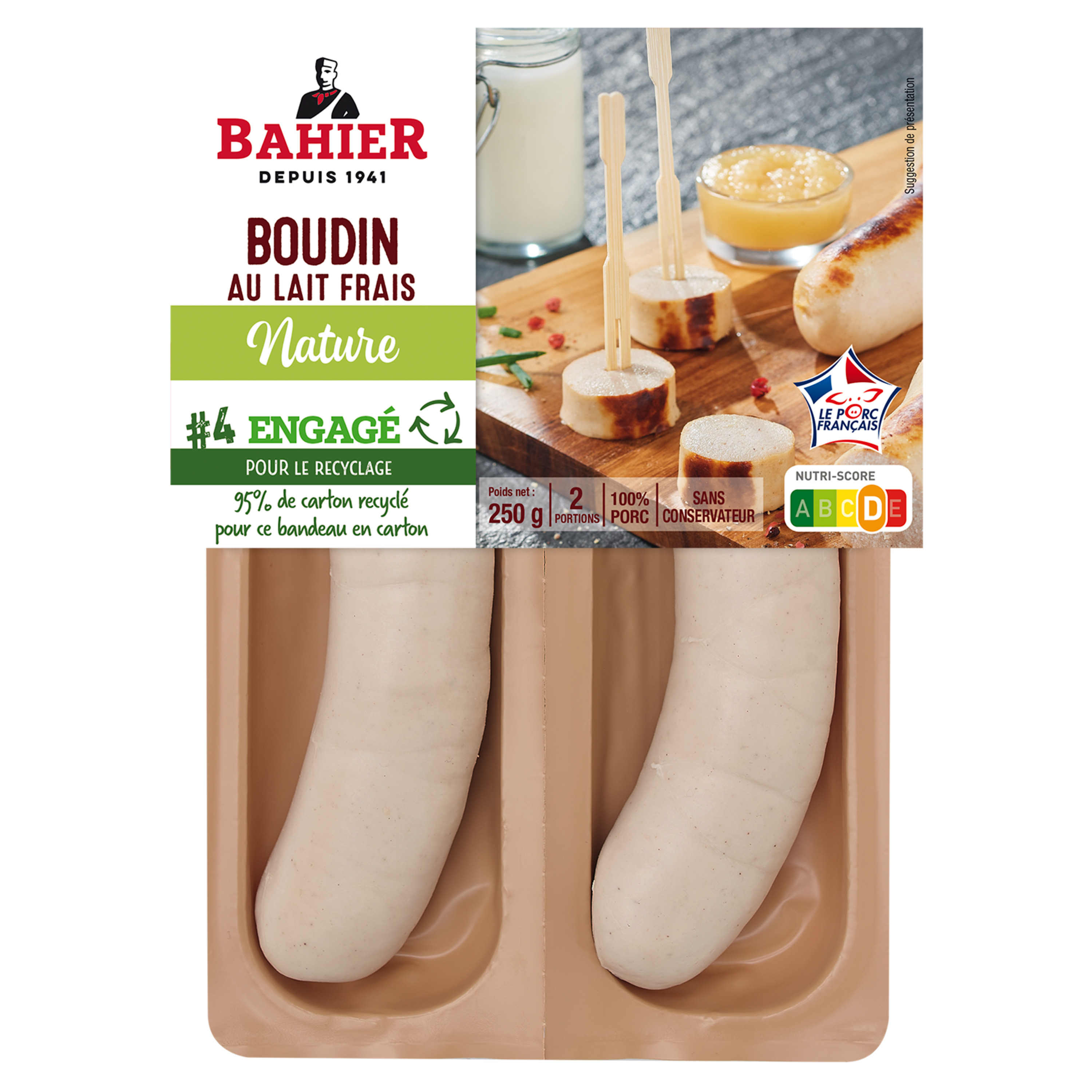 Ingrédients : Viande de porc 52%, LAIT frais demi-écrémé pasteurisé, gras de porc, eau, amidon de maïs, Porto, sel, protéïnes de LAIT, amidon modifié de pomme de terre, arômes, poivre, plantes aromatiques, boyau naturel de porc.