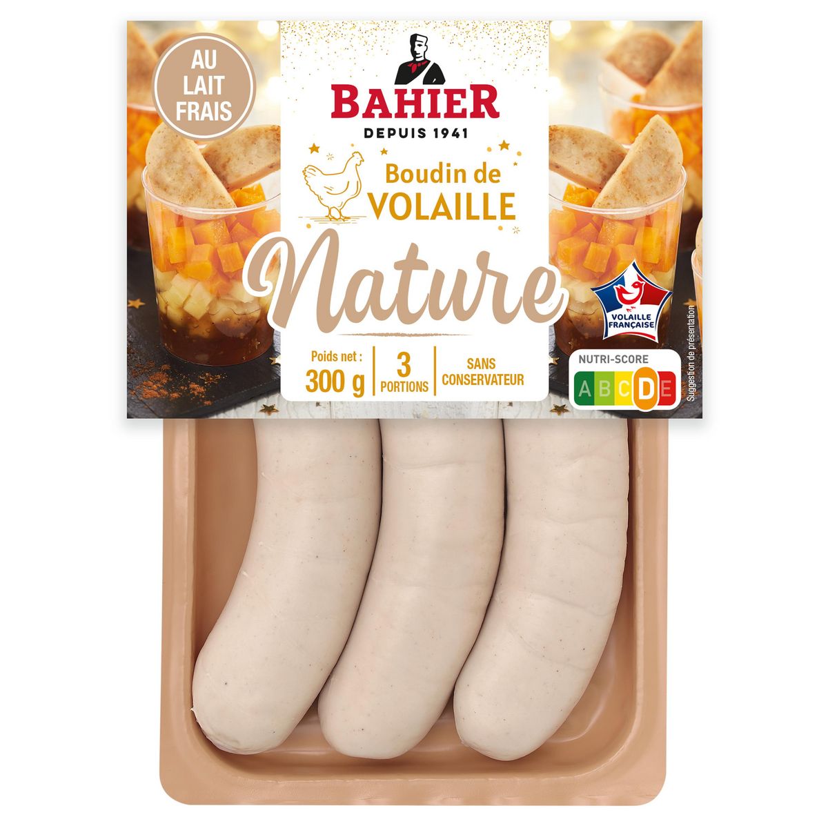 Ingrédients : Viande de volaille 47%, LAIT frais demi-écrémé pasteurisé 30%, graisse de canard, OEUFS frais pasteurisés, apéritif à base de vin, fécule de pomme de terre, sel, arômes, poivre, boyau naturel de porc.