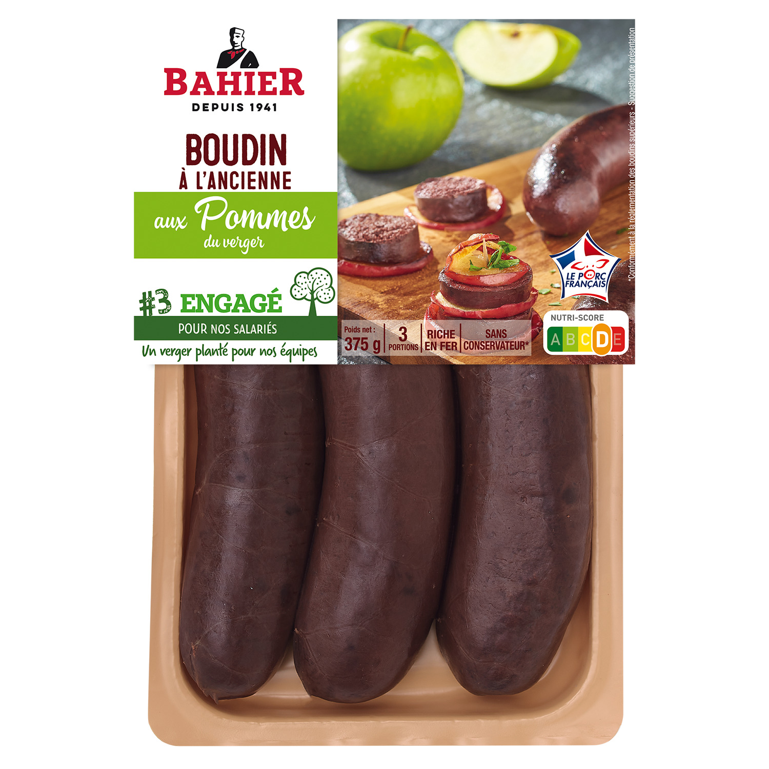 Ingrédients : Sang de porc, oignons, gras de porc, purée de pommes 12.9%, couenne, sucre, sel, épices, plantes aromatiques, boyau naturel de porc.