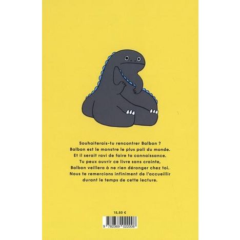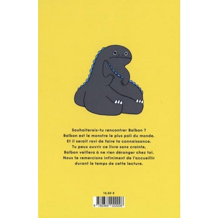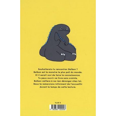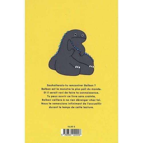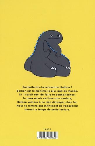 Souhaiterais-tu rencontrer Balbon ? Balbon est le monstre le plus poli du monde. Et il serait ravi de faire ta connaissance. Tu peux ouvrir ce livre sans crainte, Balbon veillera à ne rien déranger chez toi. Nous te remercions infiniment de l'accueillir durant le temps de cette lecture.