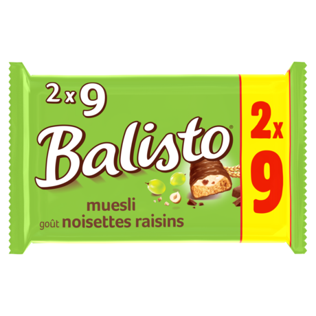 Biscuit aux céréales complètes (36%) et crème aux raisins (6.8%) goût noisette (1.9%), le tout enrobé de chocolat au lait (39%).