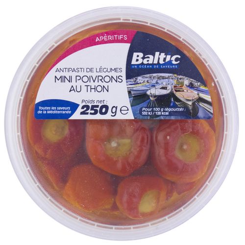 Ingrédients : huile de colza, poivrons 24% (poivrons, sel, acidifiants : acide citrique et acide acétique, conservateur : benzoate de sodium, affermissant : chlorure de calcium), piments doux 23% (piments, sucre, vinaigre d’alcool, sel conservateur : sorbate de potassium et acide benzoïque, affermissant : chlorure de calcium, antioxydant : acide ascorbique), crème de THON 17% (THON 91%, câpres, sel, amidon de maïs, acidifiant : acide lactique, persil, vinaigre d’alcool)