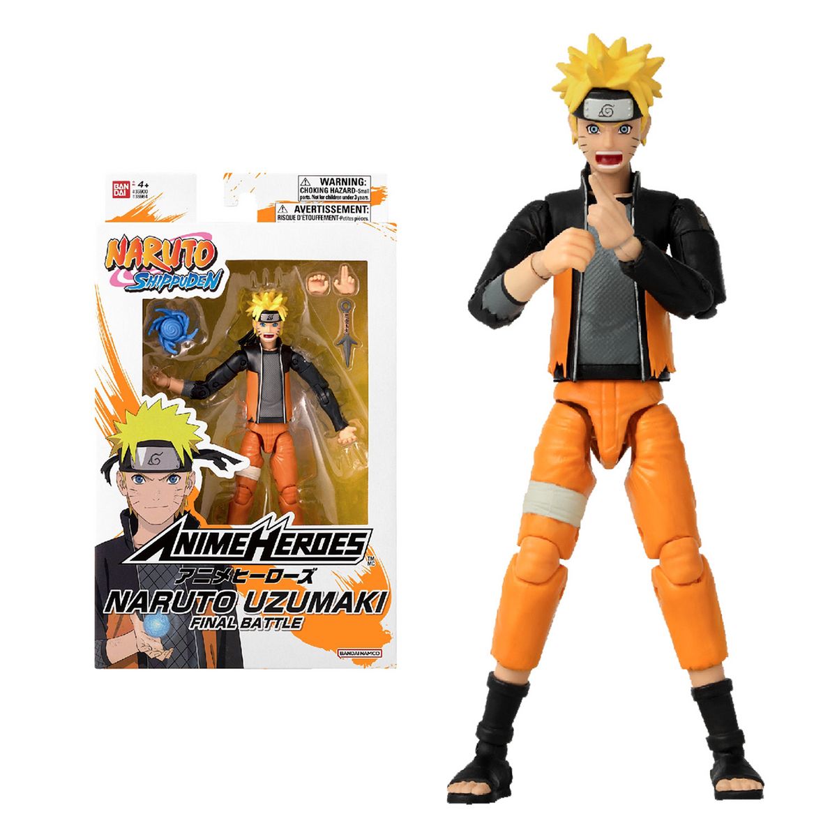 Avis aux fans, joueurs et collectionneurs de la saga Naruto, les figurines Anime Heroes sont faites pour vous ! Particulièrement détaillées, elles mesurent 17 cm et peuvent prendre toutes les positions grâce à leurs 16 points d'articulation. Ces figurines sont livrées avec des mains supplémentaires pour recréer toutes les scènes de la série. Ici, retrouvez Uzumaki Naruto, le célèbre ninja et héros de Konoha, dans sa version ""final battle"". Il porte ses vêtements abimés comme vu durant son dernier combat contre son meilleur ami Sasuke Uchiwa, combat qui annonce la fin de Naruto Shippuden. Il y a de nombreux modèles de figurines Anime Heroes Naruto à collectionner.