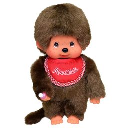 Découvrez l'adorable peluche Kiki de Monchhichi, l'icône singe avec sa tétine dans une version classique pour garçon accompagné d'un bavoir entièrement rouge !