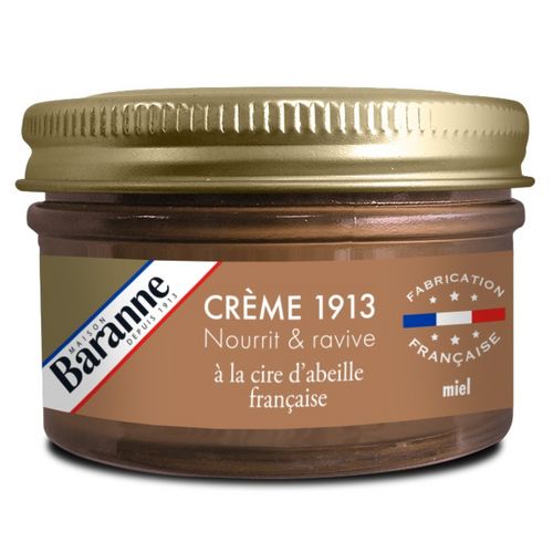 La Crème 1913 Baranne, de fabrication française et enrichie en cire d'abeille française, nourrit en profondeur, protège et ravive le cuir de vos chaussures. Sa formule, aux ingrédients selectionnées pour leurs qualités et hautes performances, apporte un soin en profondeur, assouplit, ravive les couleurs et la brillance de votre cuir.
