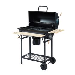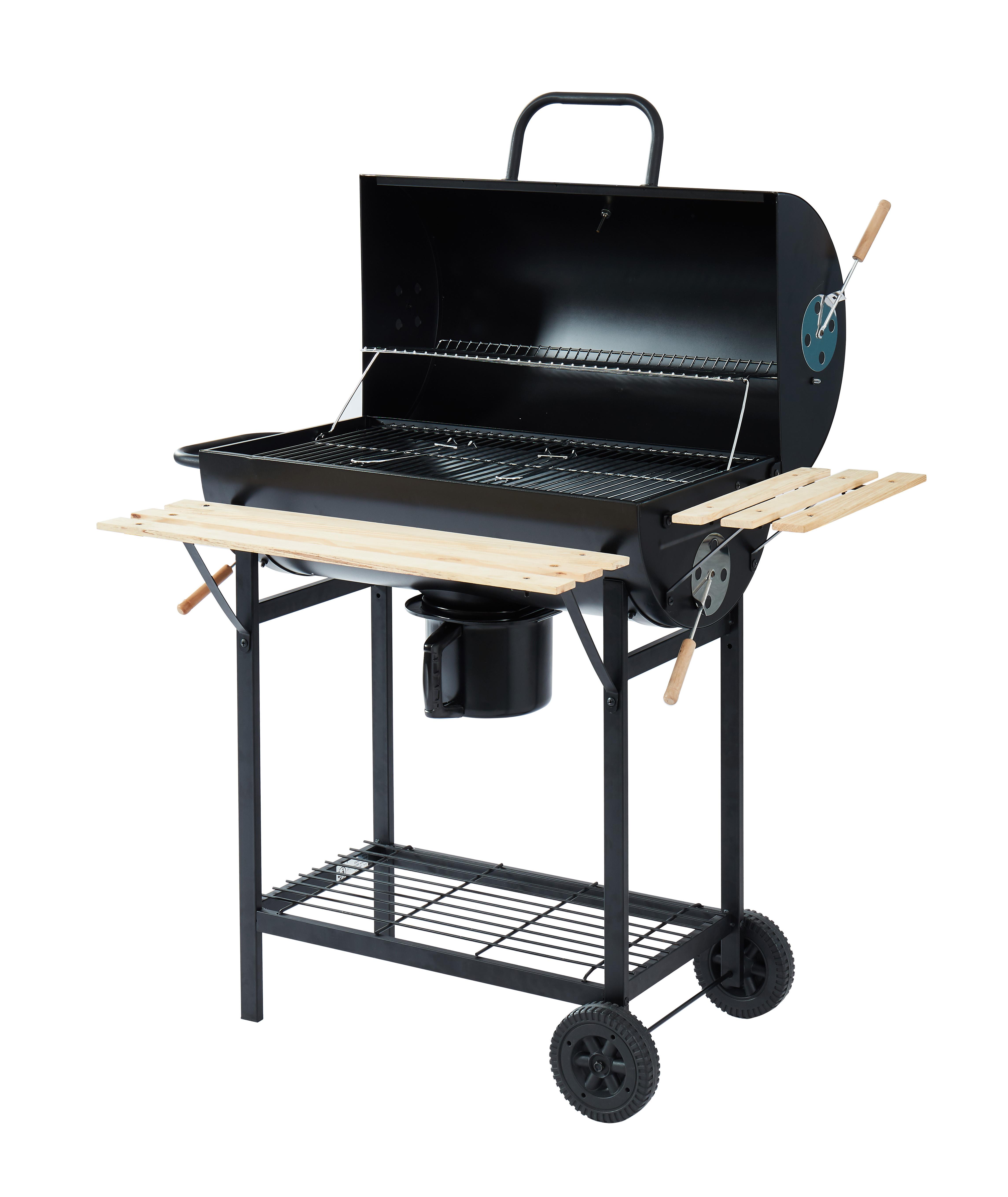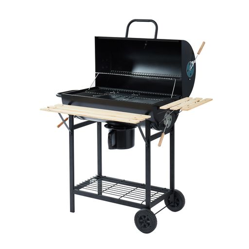 - Surface de cuisson : 38,5 x 31 cm - Tablette latérale et étagère inférieure pour disposer vos différents plats et aliments - Système d'aération à 4 trous - Dimensions produit L111 x l61 x H100 cm - Tablettes en bois - 63x25 cm / 39x22 cm - Recouvert de poudre galvanisé résistante à la chaleur - Facile à déplacer grâce à sa poignée présente sur le côté et les deux roulettes