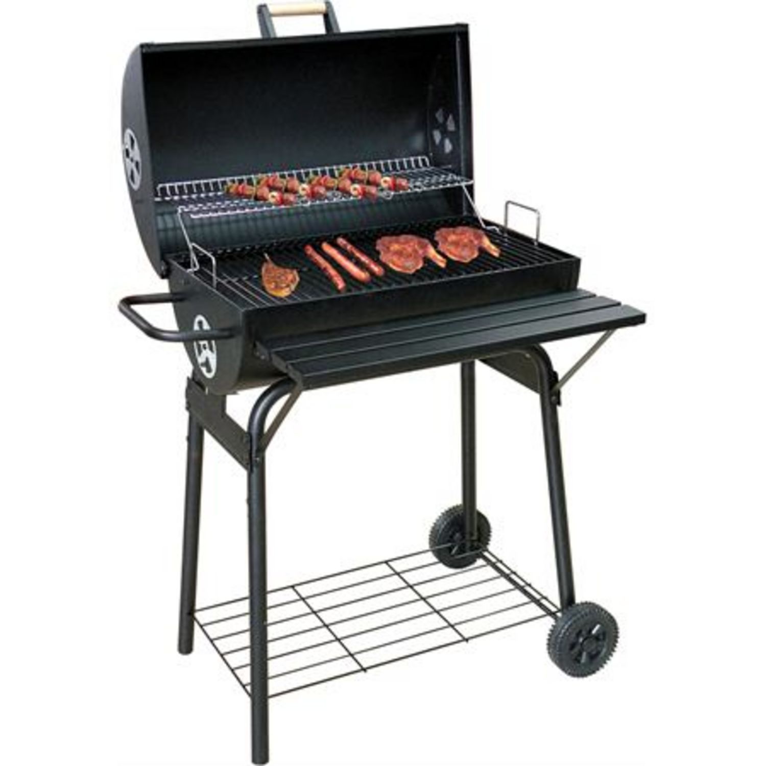 Une barbecue en forme de tonneau avec des aérations latérales pour une cuisson type four.