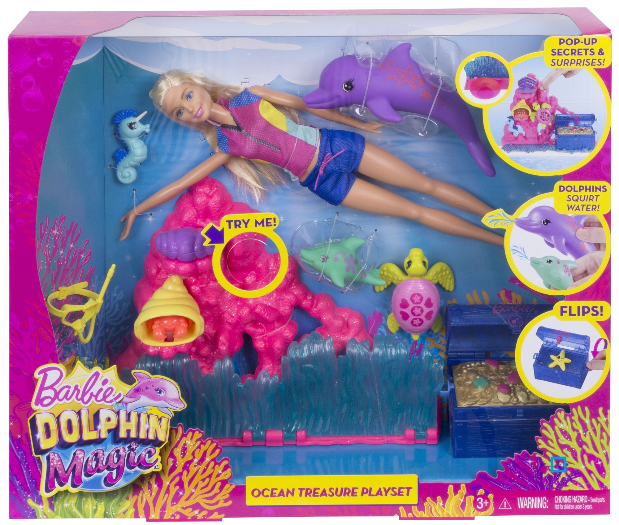 En savoir +Découvre ton coffret Barbie La magie des dauphins. Il comprend des accessoires et une poupée sur le thème des aventures sous-marines. Amuse-toi à créer des histoires et de belles aventures avec la barrière de corail, des fonctions amusantes et des surprises, 5 animaux adorables aux couleurs vives (tortue, hippocampe, bébé dauphin, crabe) dont un dauphin gicleur.