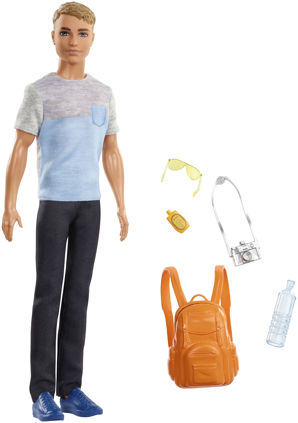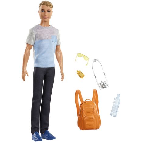 - Contient 1 poupée Ken avec tenue et accessoires, ainsi que cinq éléments sur le thème du voyage (appareil photo, bouteille d’eau, crème solaire, lunettes de soleil, sac à dos orange)