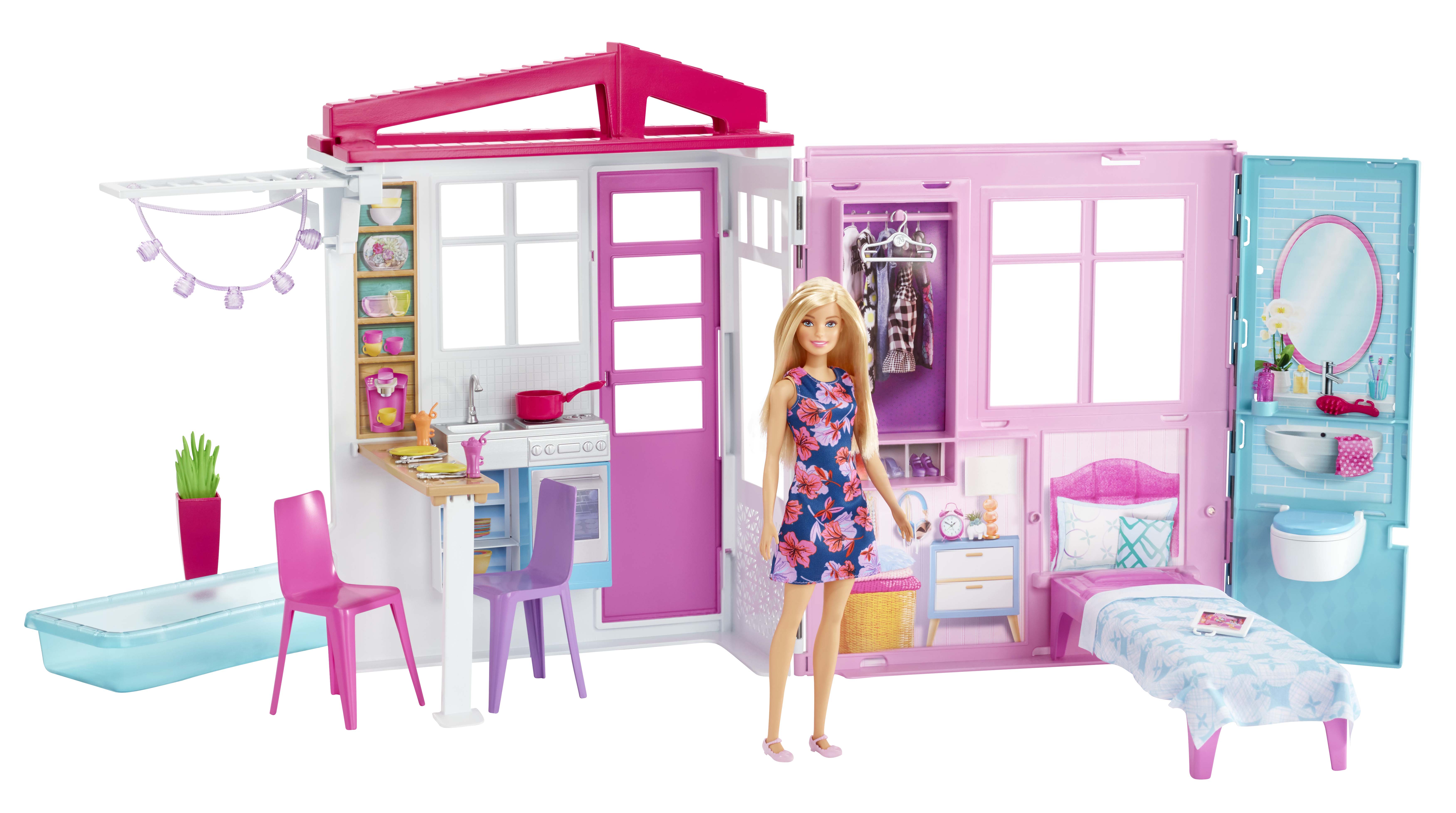 - La maison à emporter de Barbie se déploie pour révéler un espace de jeu de plain-pied de plus de 60 cm, avec cuisine, chambre, salle de bains et piscine extérieure pour jouer à l'intérieur comme à l'extérieur de la maison, ainsi qu'une poupée Barbie vêtue d'une jolie robe à fleurs et de chaussures assorties