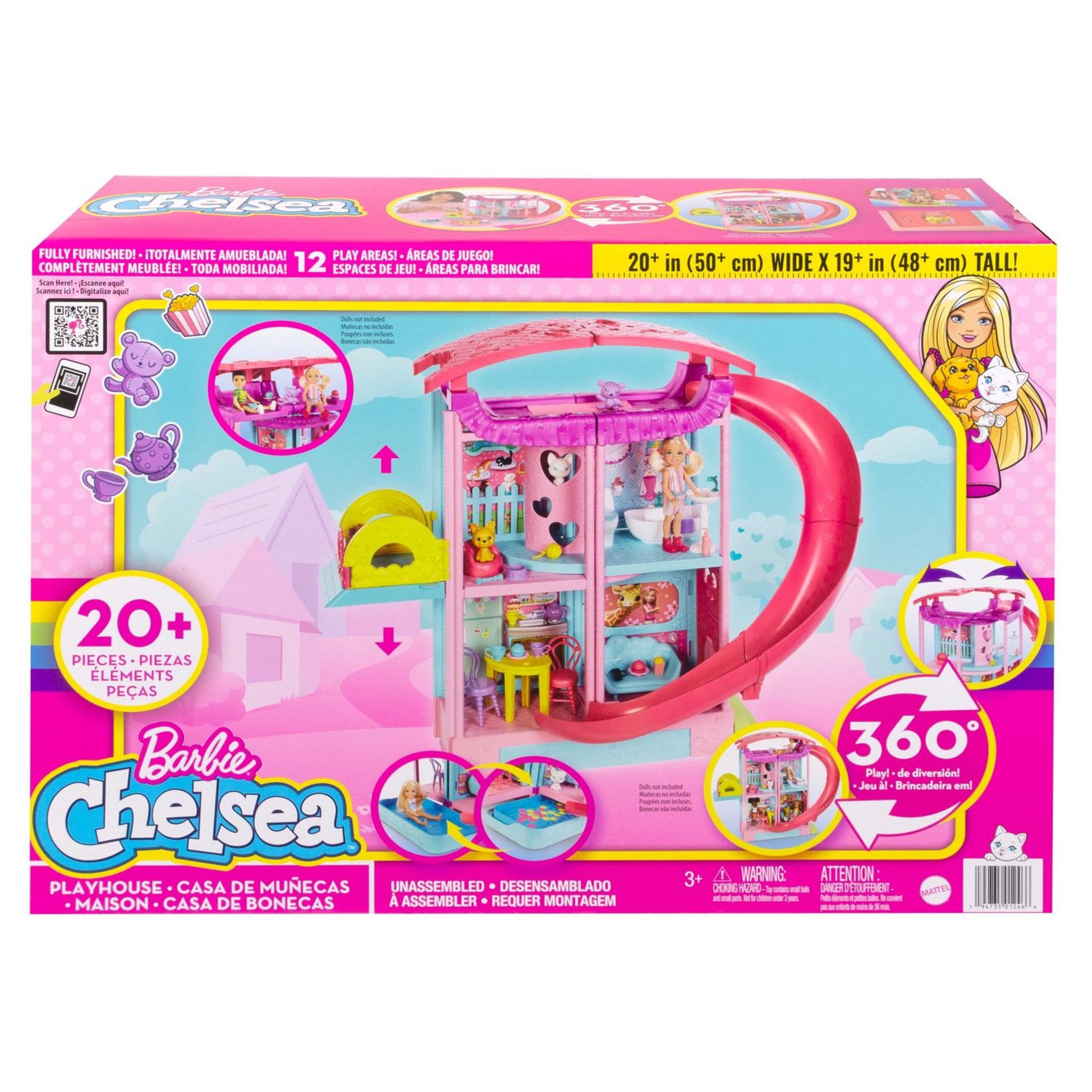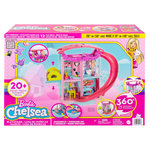 - Cette maison, dont la taille est adaptée aux poupées Chelsea de 15 cm (vendues séparément), possède un coin salon et un coin cuisine au rez-de-chaussée, une pièce pour les animaux de compagnie et une salle de bains au 1er étage, et une chambre tout en haut, sur le toit.