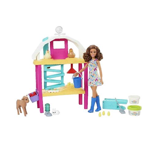 Découvrez le set de jeu 'Barbie et sa Ferme HGY88' comprenant une poupée Barbie brune de 29 cm habillée d'une robe à motif de poules et bottes bleues. Ce set inclut un poulailler, de la pâte à modeler de deux couleurs, des outils de jardinage, ainsi que plusieurs animaux en plastique : un veau, un l