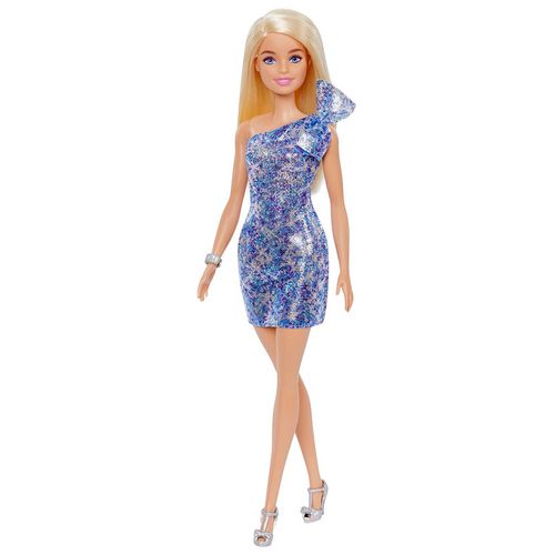 Barbie est prête à aller à la fête avec ses vêtements étincelants, son sac et ses accessoires.
