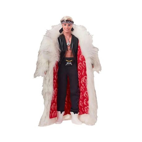 Découvrez la poupée Ken de la marque Barbie, inspirée du film 'Barbie'. Cette poupée articulée est vêtue d'un élégant manteau en fausse fourrure avec une doublure rouge, un gilet noir à franges, une bandana, des gants sans doigts, et une ceinture ornée de la mention 'KEN'. Elle est fabriquée en plas