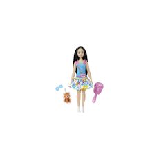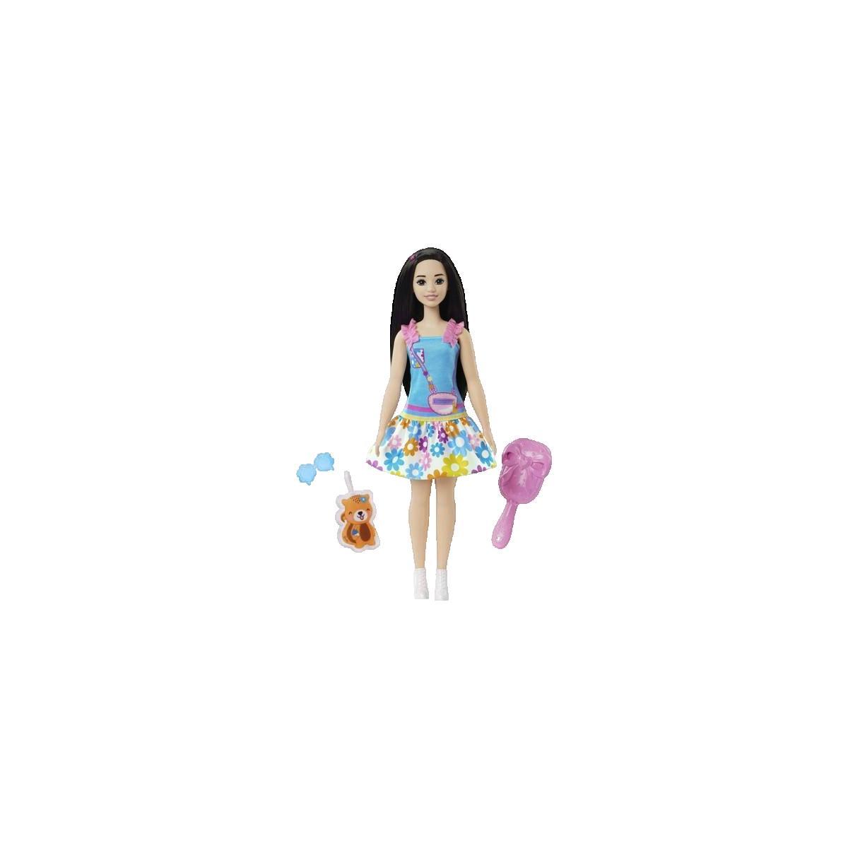 La poupée 'Ma Première Barbie™' de la marque Barbie est conçue pour les enfants à partir de 3 ans. Elle dispose d'un corps souple et articulé, offrant une grande liberté de mouvement pour stimuler l'imagination. La poupée porte une robe bleue à volants roses, accompagnée d'accessoires ludiques tels