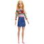 Barbie porte un t-shirt à rayures multicolores orné d’un cœur rose à paillettes et une jupe en denim.