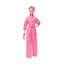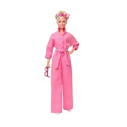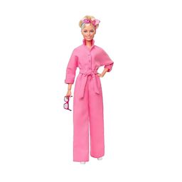 Découvrez la poupée de collection Barbie Margot Robbie, inspirée du célèbre film. Cette poupée est habillée d'une élégante combinaison rose avec manches trois-quarts, accompagnée d'un foulard imprimé et de grandes lunettes de soleil. Conçue avec des matériaux de haute qualité, plastique et tissu, el