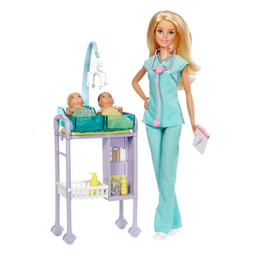Amuse-toi avec la poupée Barbie pédiatre ! Barbie est prête à soigner les bébés. Barbie est équipée d'un stéthoscope ainsi que du matériel médical idéal pour prendre soin de la santé de tous les enfants : biberon, carnet de santé, couvertures...
