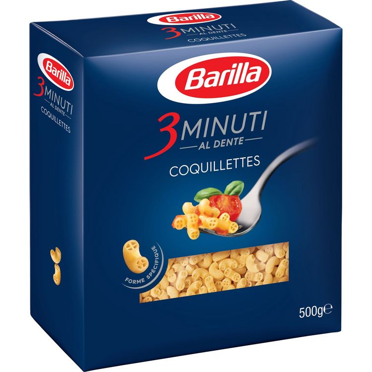 PÂTES ALIMENTAIRES Découvrez le goût unique et la qualité al dente des pâtes Barilla, en seulement 3 minutes ! Nous avons créé pour vous des formes spécifiques de pâtes [adaptation] qui garantissent une cuisson plus rapide et toujours le plaisir de vos pâtes Barilla. Goûtez vos plats préférés, désormais en 3 minutes !