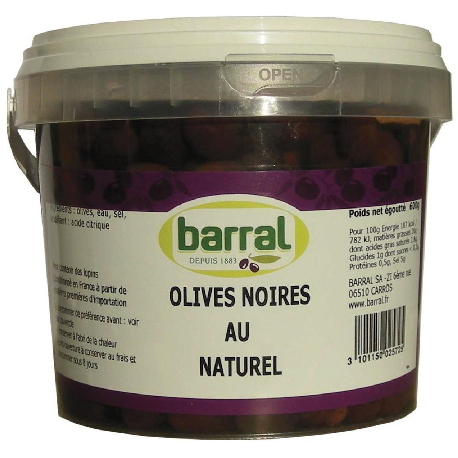 Olives noires, Eau de ville, Sel marin, Acide citrique, Sorbate de potassium