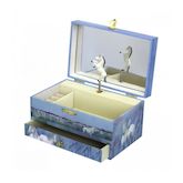 Grande boite à bijoux musicale avec tiroir, baguier et grand miroir.Un cheval cabré se met à danser lorsque vous actionnez le mouvement musical situé à l'arrrière du coffret. Musique : LULLABY - F.P. SCHUBERT. Livré en boite.