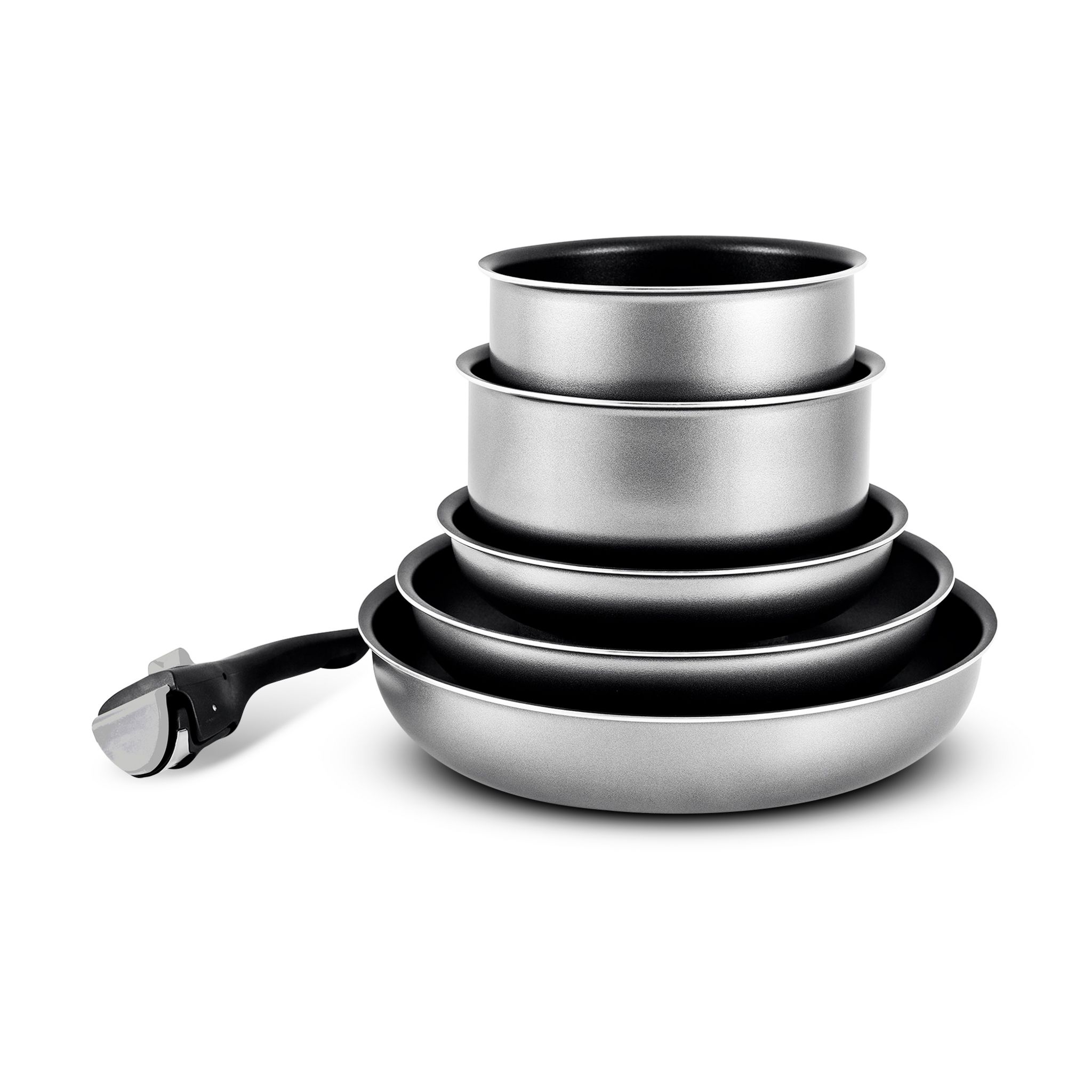 Batterie de cuisine composée de 3 poêles 20/24/28cm + 2 casseroles 16/18cm en aluminium, + 1 poignée amovible en bakélite (gain de place et rangement facilité !). Léger et très résistant l'aluminium permet une répartition homogène de la chaleur. Revêtement intérieur antiadhésif pour une cuisson allégée en matières grasses et un nettoyage facile Cette batterie est compatible tous feux dont induction et passe aussi au four (sans la poignée).