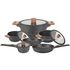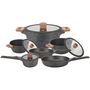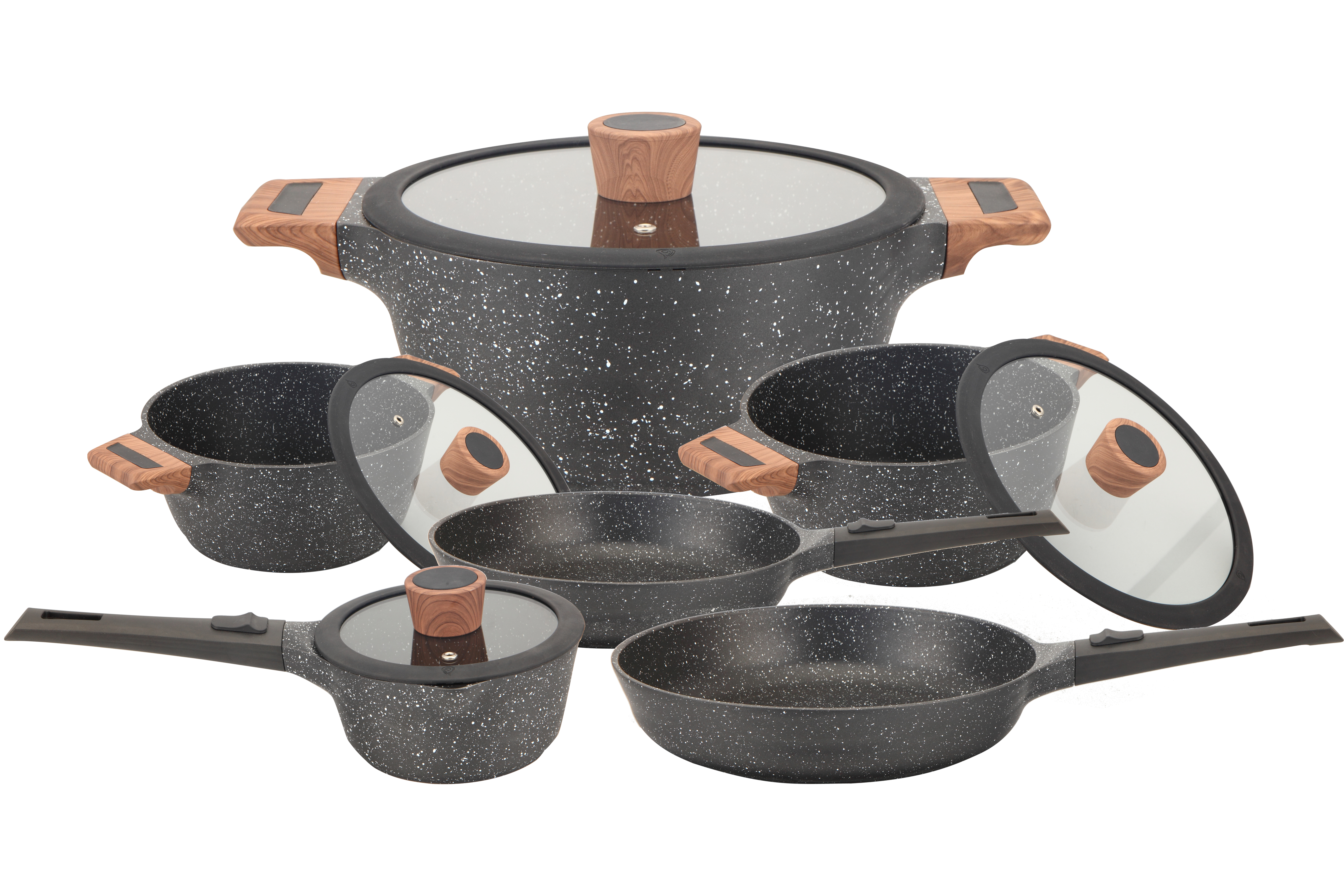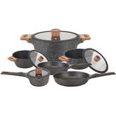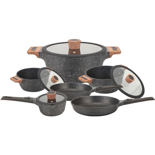 Batterie de cuisine à induction de 12 pièces en fonte d'aluminium et finition bois composée de 3 Faitouts 20/24/28CM avec couvercle + 1 casserole 16CM avec couvercle + 2 poêles 24/28CM + 2 manches amovibles. Tous feux dont induction.