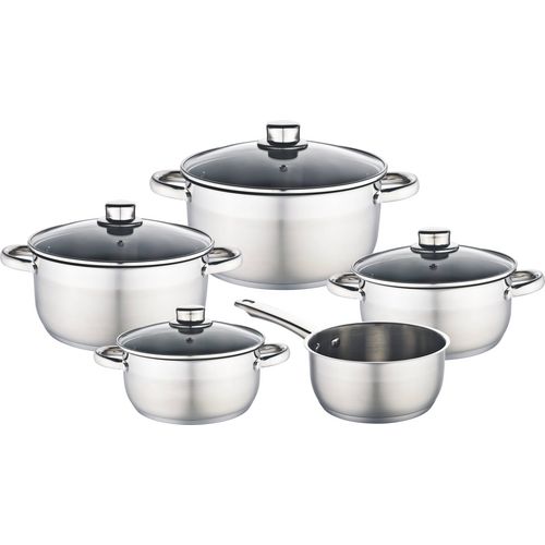 Découvrez cette batterie 9 pièces en acier inoxydable - couvercle vert avec bord inox et trou vapeur-équipement métal-résistant. Compatible lave vaisselle, tous feux dont induction.