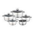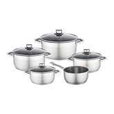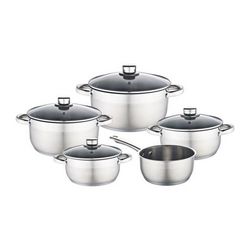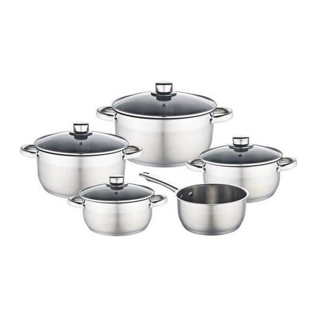 Batterie 9 pces inox - 1 faitout avec couvercle en verre 16 cm + 1 faitout avec couvercle en verre 20 cm + 1 marmite avec couvercle en verre 20 cm + 1 marmite avec couvercle en verre 24 cm + 1 casserole 16 cm - Acier inoxydable - Couvercle en verre avec trou vapeur - Equipement en métal - Résistant au lave vaisselle -