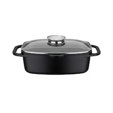 Baumalu 382983 Cocotte rôtissoire 382983 de Baumalu. Cette cocotte rôtissoire grand volume combine générosité, performance et polyvalence pour des plats savoureux au quotidien comme pour les grandes occasions. Idéale pour réussir vos recettes mijotées, rôties ou grillées avec simplicité et efficacité §. Son design noir sobre et élégant s'intègre parfaitement dans toutes les cuisines. En fonte d'aluminium, épaisseur 1.8 mm, alliant robustesse et légèreté pour une manipulation facilitée au quotidien. Fond grill parfait pour saisir vos viandes ou légumes à la manière d'une poêle grill, tout en conservant leurs saveurs Poignées fixes. Revêtement intérieur antiadhésif en céramique assurant une cuisson douce et maîtrisée avec peu de matières grasses, tout en évitant que les aliments accrochent. Bec verseur intégré facilitant le service et la récupération des jus de cuisson. Zoné filtre / passoire sur le couvercle qui se positionne devant le bec verseur. Équipée d'un couvercle en verre avec bouton Arôme en inox et trou vapeur, cette mijoteuse est parfaite pour les cuissons à l'étouffée, lentes et maîtrisées. Ingénieux, le bouton « Arôme » permet l'ajout progressif de liquides pendant la cuisson. Compatible four jusqu'à 240°C sans le couvercle et jusqu'à 180°C avec le couvercle : parfait pour les cuissons combinées de vos plats ! Commencez la cuisson en saisissant les aliments puis terminez en mijotant lentement au four.