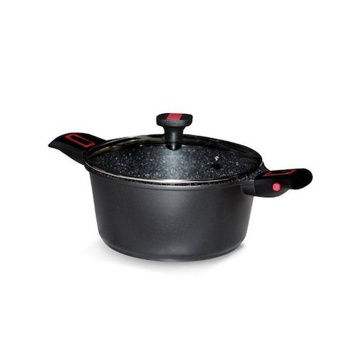 Faitout 26 cm avec couvercle - Granit Pro - Une gamme complète d'ustensiles de cuisson pour une cuisine saine : sans ou avec très peu de matière grasse ! Accessoires amovibles pour un rangement compact et un gain de place dans vos placards. En fonte d'aluminium pour une diffusion homogène de la chaleur et une cuisson uniforme. Revêtement intérieur en céramique. Livrée avec 1 manche amovible en bakélite. Le manche se clipse facilement et se verrouille en appuyant sur le loquet noir de la poignée. Il s'enlève tout aussi facilement en appuyant sur le bouton rouge sur le coté de la poignée. Couvercle en verre - Nettoyage facile : passe au lave-vaisselle (sans poignées et manche). Extérieur Noir. Tous feux dont induction.