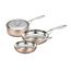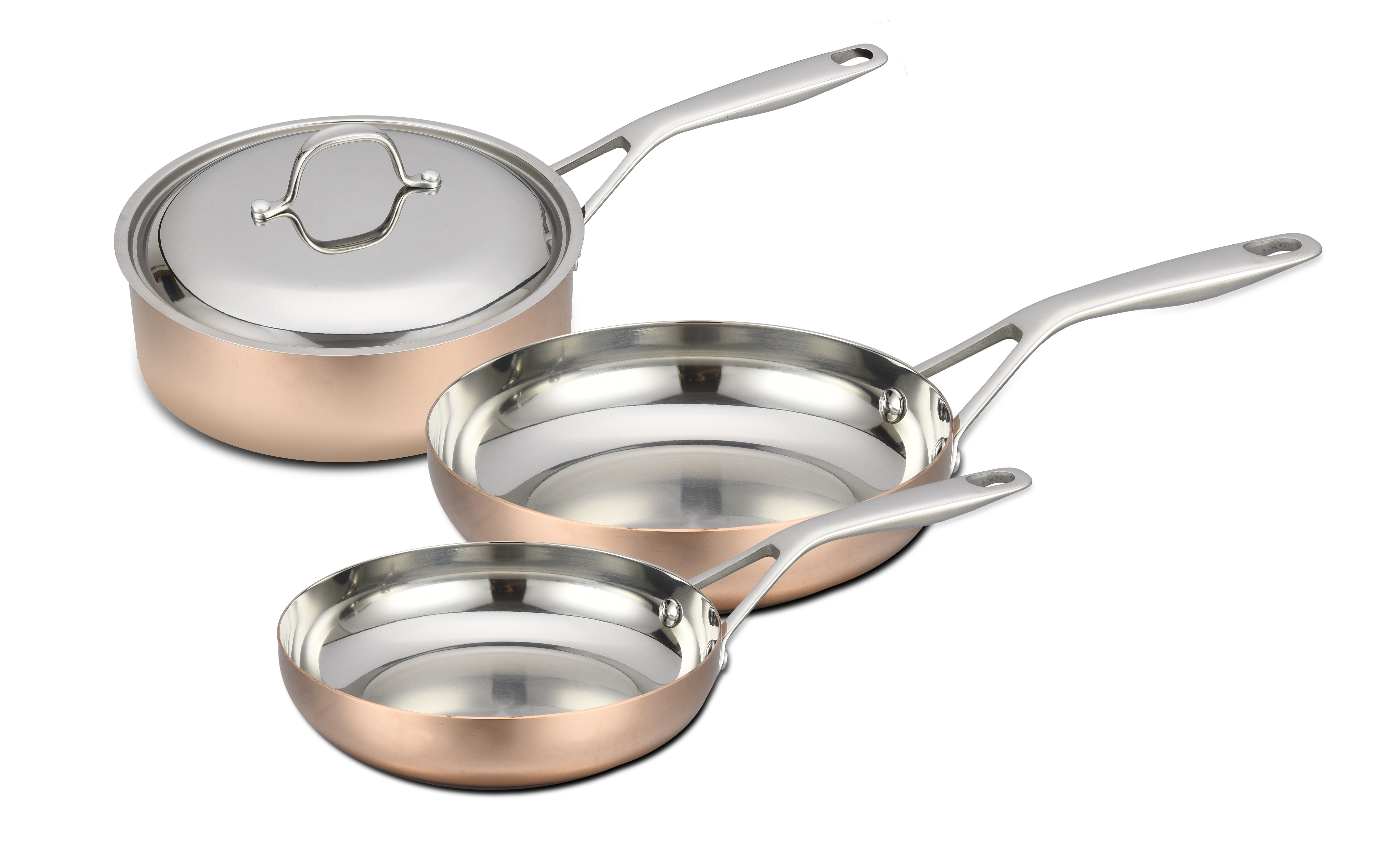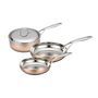 Découvrez ce lot de 2 poêles 20 et 28 cm + 1 sauteuse de 24 cm épaisseur 1,5 mm (1,2 mm cuivre + 0,3 mm en acier inoxydable) tous feux dont induction. Couvercle bombé inox poignées fonte d'inox. Livré avec emballage et pochon en tissu.