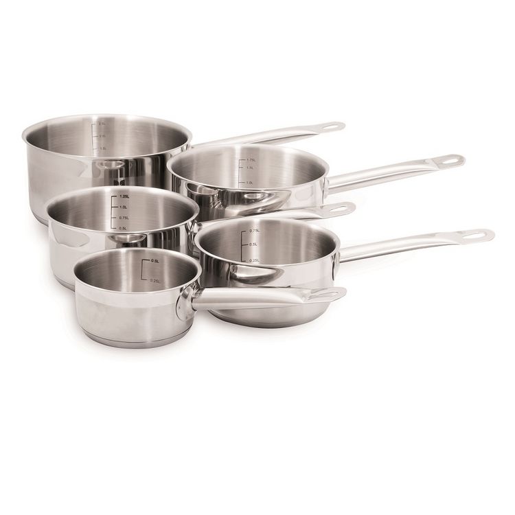 5 casseroles inox 12 14 16 18 20 cm Acier inoxydable Fond triple diffuseur inox/alu/inox Bords verseurs anti gouttes, intérieur satiné avec graduation en litre Extérieur satiné et poli miroir Poignées « froides » la poignée creuse réduit la conduction de la chaleur
